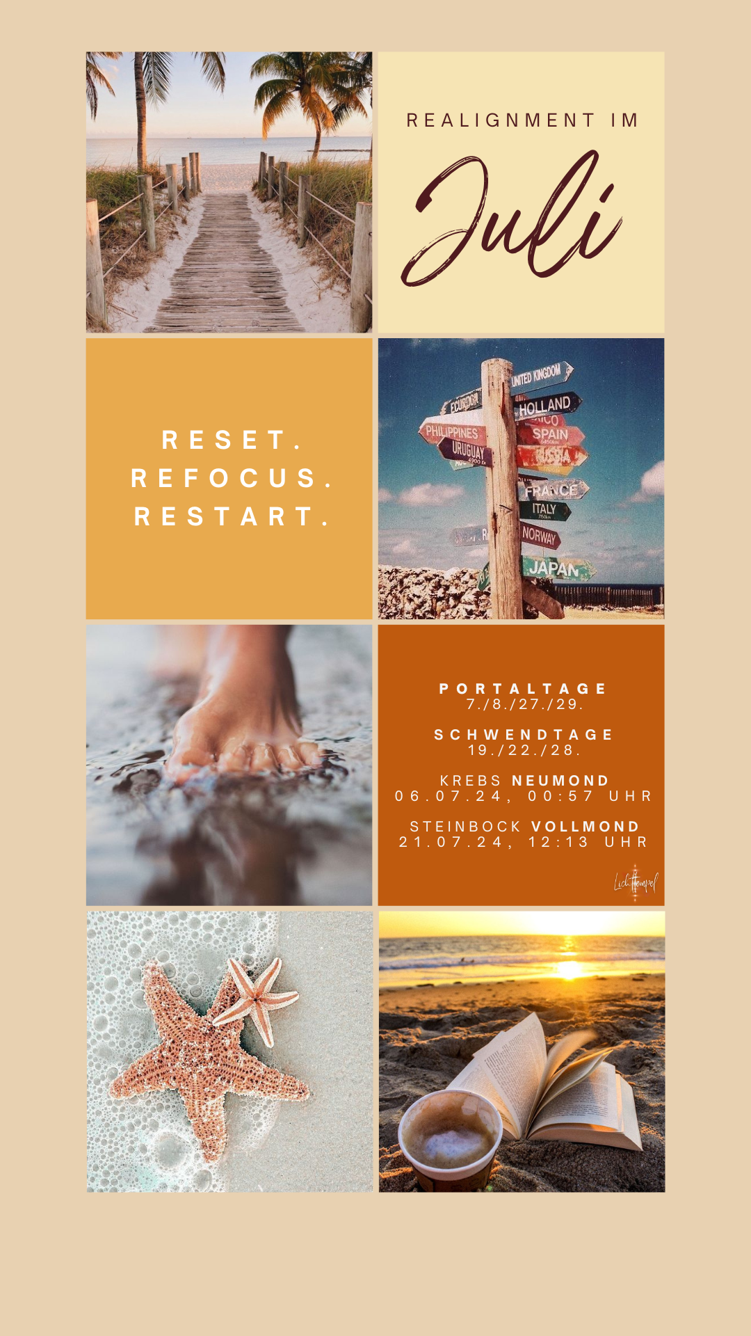 Das ist jetzt wichtig! Denn mit dem Neumond erreicht uns eine lange und intensive Phase der Manifestation. Dem Neumond im Krebs am Samstag, 6.7.24 folgen nämlich 2 energieintensivierende Portaltage am 7. & 8.7.24, die die Neumond-Energie um einiges strecken. Und diese geht an die Gefühle, unser sensitives Wesen. "Was ist echt? Was war es nie?" werden 2 zentrale Fragen für diesen Neumond sein. Tage, die einladen, Dinge, die uns wichtig sind, für die wir brennen, die uns erfüllen, endlich auf den Weg zu bringen und alles andere nun da lassen - vor dem Neumond.